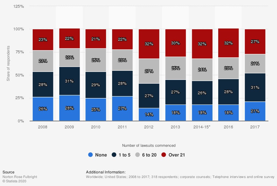 chart - https://www.statista.com/statistics/892472/legal-services-number-of-lawsuits-per-company-worldwide/